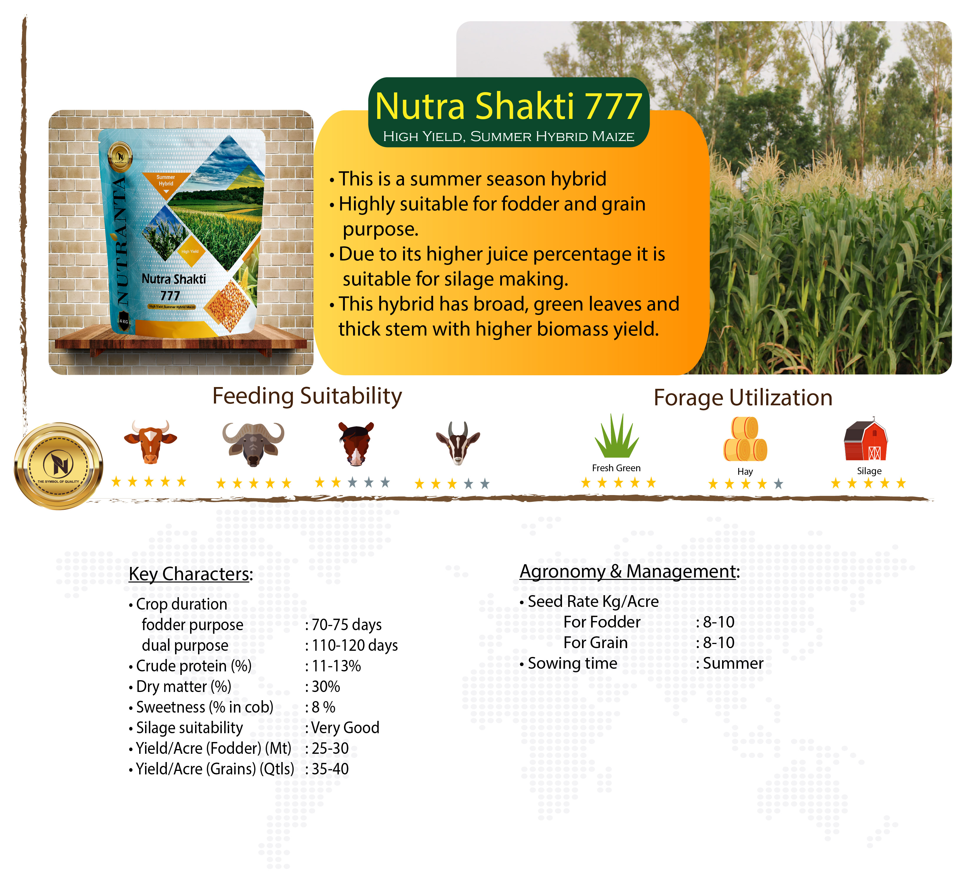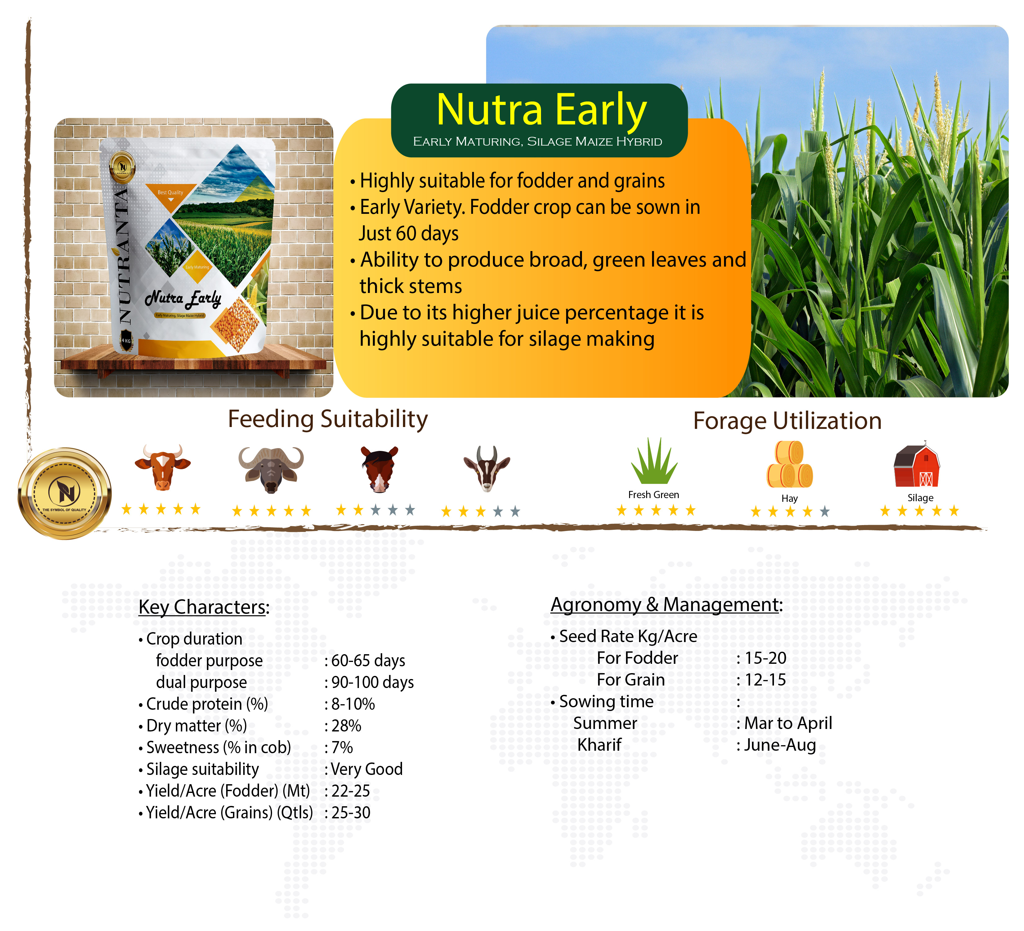 Our Nutra Early Product can be sown from March to August and is a very short duration variety with excellent suitability for Fodder as well as for Grains.